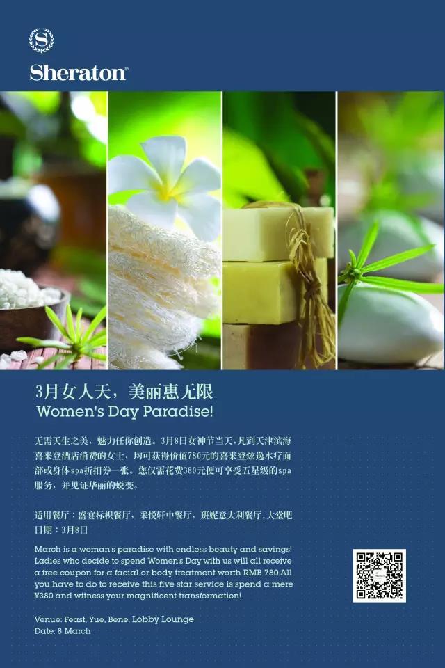 无需天生之美,魅力任你创造。3月8日女神节当天,凡到天津滨海喜来登酒店餐厅(采悦轩,标帜盛宴餐厅,班妮意大利餐厅,大堂吧)消费的女士,均可获得价值780元的喜来登炫逸水疗面部或身体spa折扣券一张,您仅需花费380元便可享受五星级的spa服务,感受全然的放松和宠爱,我们的护理项目为您带来全身心的抚慰。