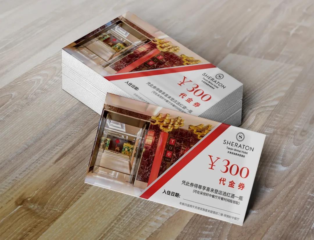 3.采悦轩中餐厅300元代金券一张(该代金券不可累积使用,不设找零,不适用于海鲜类,酒水类;用餐一次限用一张;使用前需提前两天预定,预订电话02265288888转采悦轩中餐厅)| 300 CNY food and beverage credit at YUE per night per room